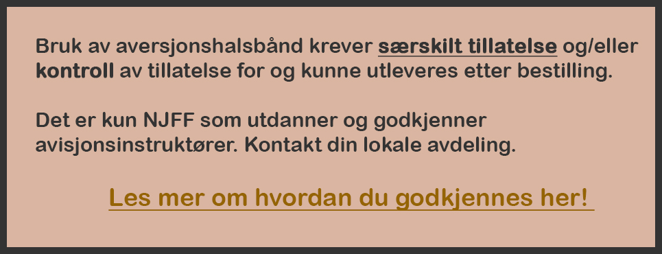 NB: Bruk av aversjonshalsbånd går også under navnet dressurhalsbånd. Krever godkjent utdanning som aversjonsinstruktør, pr nå er det kun NJFF som utdanner instruktører. Kontakt din lokale avdeling.